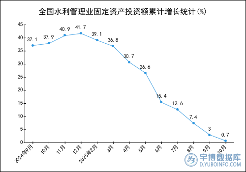 2025年1-10月全國水利管理業(yè)固定資產(chǎn)投資額(累計增長)為0.7%