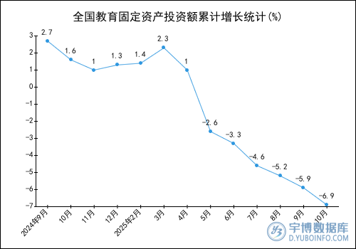 2025年1-10月全國(guó)教育固定資產(chǎn)投資額(累計(jì)增長(zhǎng))為-6.9%