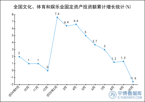2025年1-10月全國文化、體育和娛樂業(yè)固定資產(chǎn)投資額(累計增長)為-1.6%