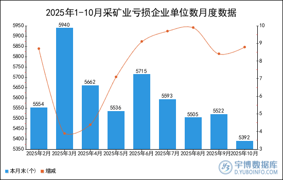 2025年10月采礦業(yè)虧損企業(yè)單位數(shù)本月末為5392個(gè),增減8.8%。