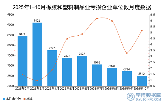 2025年10月橡膠和塑料制品業(yè)虧損企業(yè)單位數(shù)本月末為6512個(gè),增減5.2%。