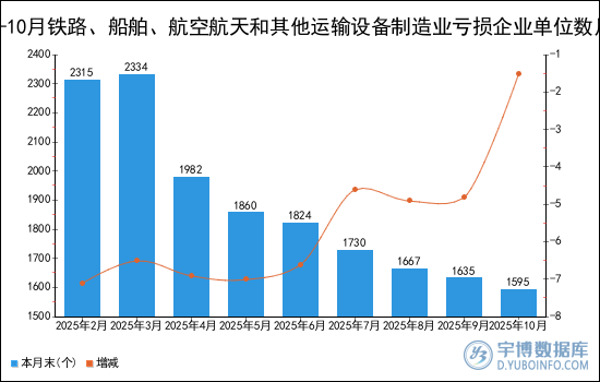 2025年10月鐵路、船舶、航空航天和其他運(yùn)輸設(shè)備制造業(yè)虧損企業(yè)單位數(shù)本月末為1595個(gè)。