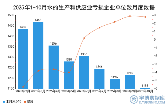 2025年10月水的生產(chǎn)和供應(yīng)業(yè)虧損企業(yè)單位數(shù)本月末為1155個(gè),增減2.8%。