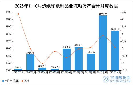 2025年10月造紙和紙制品業(yè)流動(dòng)資產(chǎn)合計(jì)本月末為8848.4億元,增減0.1%。