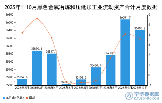 2025年10月黑色金屬冶煉和壓延加工業(yè)流動(dòng)資產(chǎn)合計(jì)本月末為36405.2億元,增減3.6%。