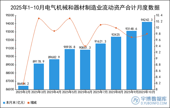 2025年10月電氣機械和器材制造業(yè)流動資產(chǎn)合計本月末為94242.3億元,增減9.8%。