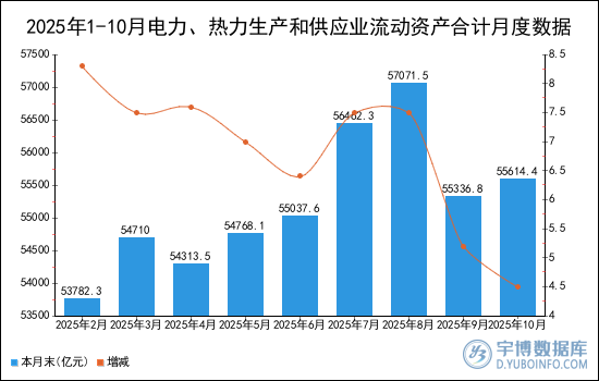 2025年10月電力、熱力生產(chǎn)和供應業(yè)流動資產(chǎn)合計本月末為55614.4億元,增減4.5%。