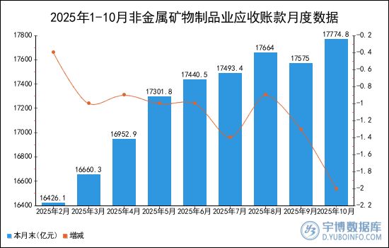 2025年10月非金屬礦物制品業(yè)應(yīng)收賬款本月末為17774.8億元。