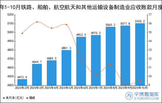 2025年10月鐵路、船舶、航空航天和其他運(yùn)輸設(shè)備制造業(yè)應(yīng)收賬款本月末為5105.2億元,增減9.6%。