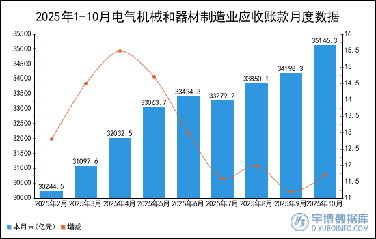 2025年10月電氣機械和器材制造業(yè)應(yīng)收賬款本月末為35146.3億元,增減11.7%。