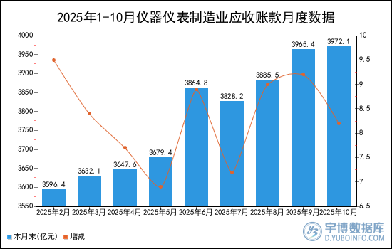 2025年10月儀器儀表制造業(yè)應(yīng)收賬款本月末為3972.1億元,增減8.2%。