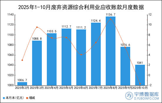 2025年10月廢棄資源綜合利用業(yè)應(yīng)收賬款本月末為1041億元。
