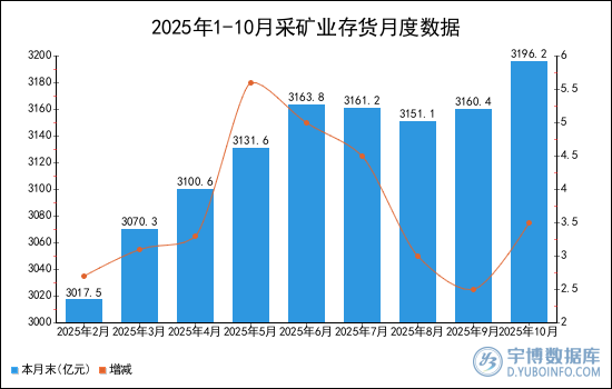 2025年10月采礦業(yè)存貨本月末為3196.2億元,增減3.5%。