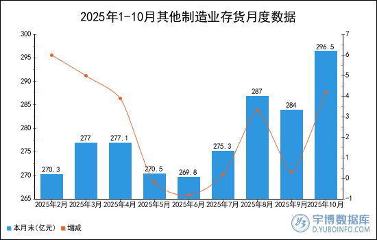 2025年10月其他制造業(yè)存貨本月末為296.5億元,增減4.2%。