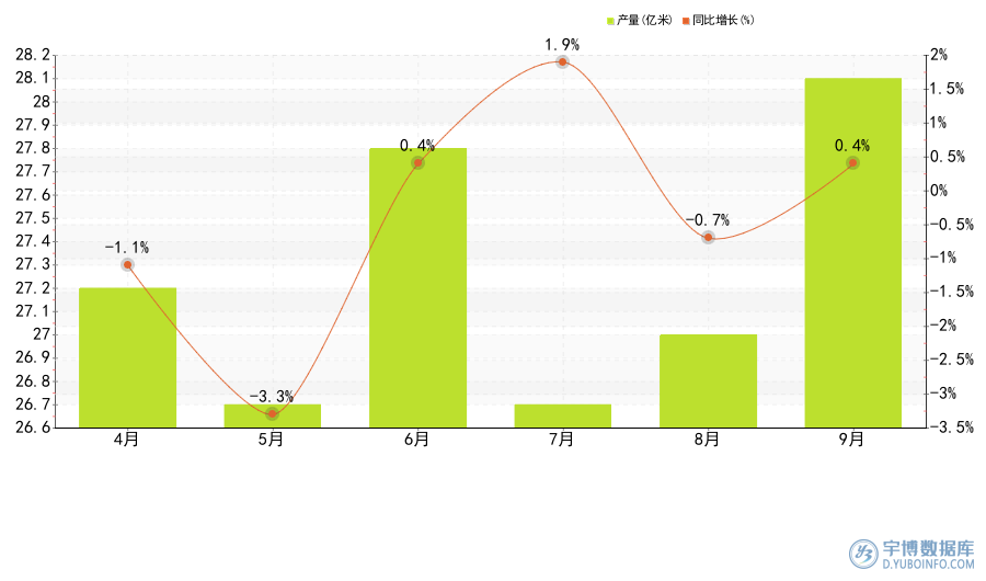 報(bào)告網(wǎng)監(jiān)測(cè)數(shù)據(jù)統(tǒng)計(jì):2025年9月全國(guó)布產(chǎn)量為28.1億米,同比增長(zhǎng)0.4%;1-9月份累計(jì)產(chǎn)量為237.7億米,同比降低-0.3%。