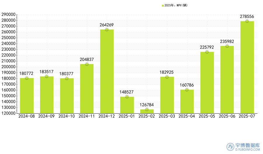 據(jù)報(bào)告網(wǎng)監(jiān)測數(shù)據(jù)顯示,2025年7國內(nèi)MPV銷量為278556輛,環(huán)比上漲了18.04%,銷量增加了42574輛。